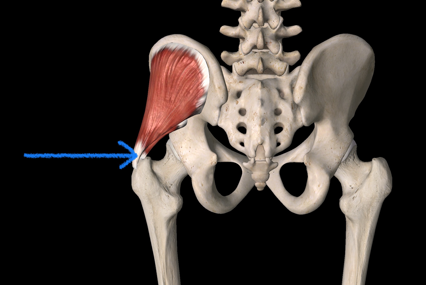 Nummer 1: “Innklemmings fenomenet”. Tar du på utsiden av beinet ditt der hvor du tror hoften ligger, og føler et hardt bein da er du trolig på “trochanter” (se blå pil på bilde 2). På dette beinet så fester det seg flere muskler, to av dem heter gluteus medius (glut med) og gluteus minimus (glut min). Disse musklene fester seg på oversiden av trochanter og i posisjoner hvor beinet føres innover forbi midtlinjen (adduksjon) (eller overkropp til motsatt side) kan de underste fibrene av senen (oftest glut med) stå i fare for å bli klemt (Bilde 2).