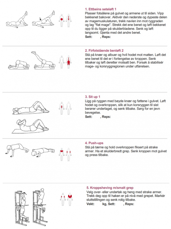 Jeg tror det er lurt å begynne med få øvelser 3-5 stk. (i stedet for 10-12), som tar kort tid uten bruk av mange hjelpemidler, med økt sjanse for å klare å gjennomføre regelmessig trening over tid. Om ikke hver dag, så en 3-4x i uka. Treningen blir da en del av hverdagen.