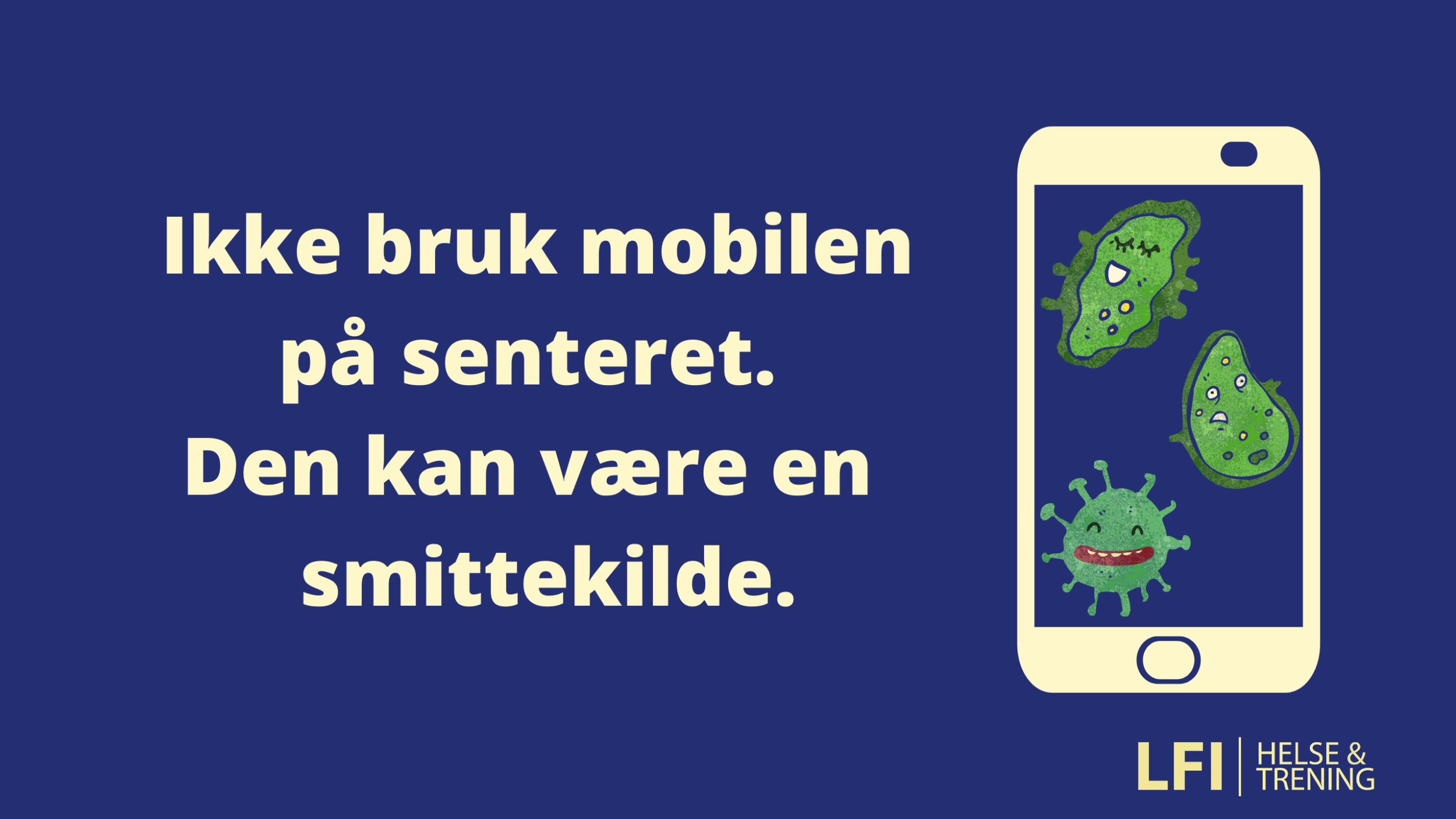 Mobilen er kjent som en smittebærer. Selv om du har brukt Antibac på telefonen ønsker vi at du holder den i lomma mens du er inne på senteret.